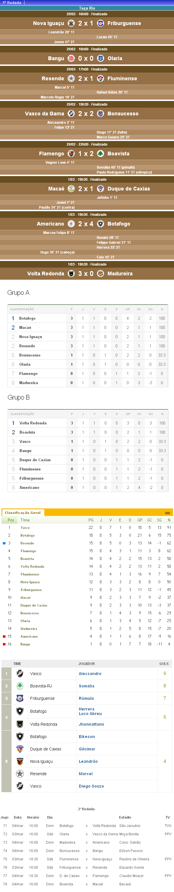 Terminada a 1ª rodada da Taça Rio, que corresponde ao 2º turno do Campeonato Estadual, o Vasco, que empatou com o Bonsucesso por 2 a 2, está na 3ª colocação do Grupo B, com 1 ponto, 2 pontos atrás dos líderes Boavista e Volta Redonda.