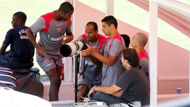 O Vasco fez o último treino antes de encarar o Olaria neste sábado, às 16h, em Moça Bonita, pela segunda rodada da Taça Rio. Após os trabalhos físicos e táticos, os jogadores resolveram brincar de fotógrafos. O zagueiro Dedé, o meia Diego Souza e o atacante Alecsandro se revezaram para utilizar a câmera do fotógrafo do cruzmaltino, Marcelo Sadio.