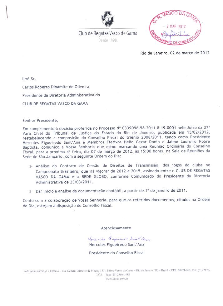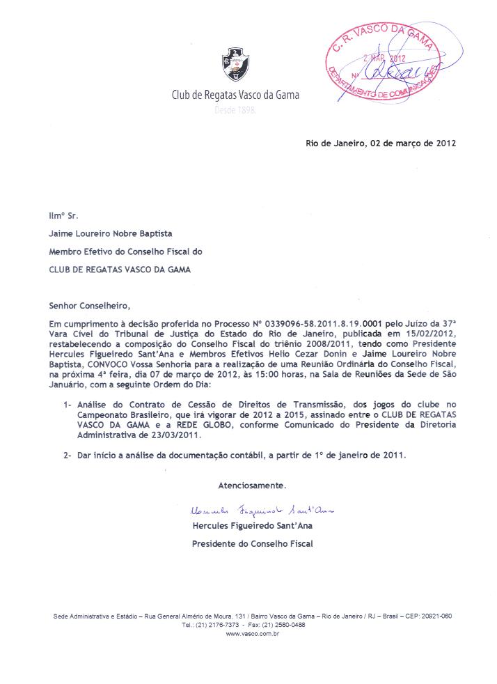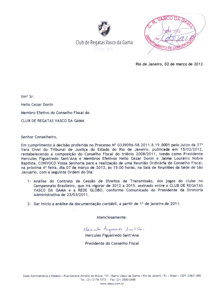 Hércules Figueiredo convoca reunião do Conselho Fiscal do Vasco