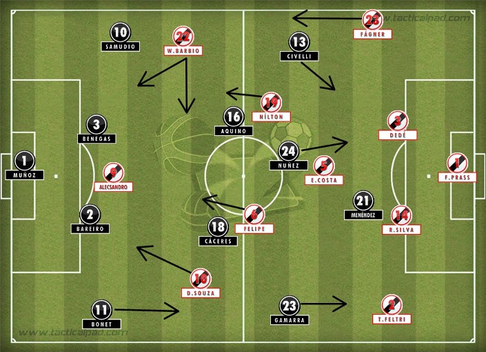 - Menos mal que Fágner seguia bem, mesmo com Samudio aparecendo mais pela esquerda se juntando a Civelli. O lateral evoluiu na marcação e continua sendo ótima opção de velocidade pela direita. Compensou a centralização de Diego Souza em vários momentos;