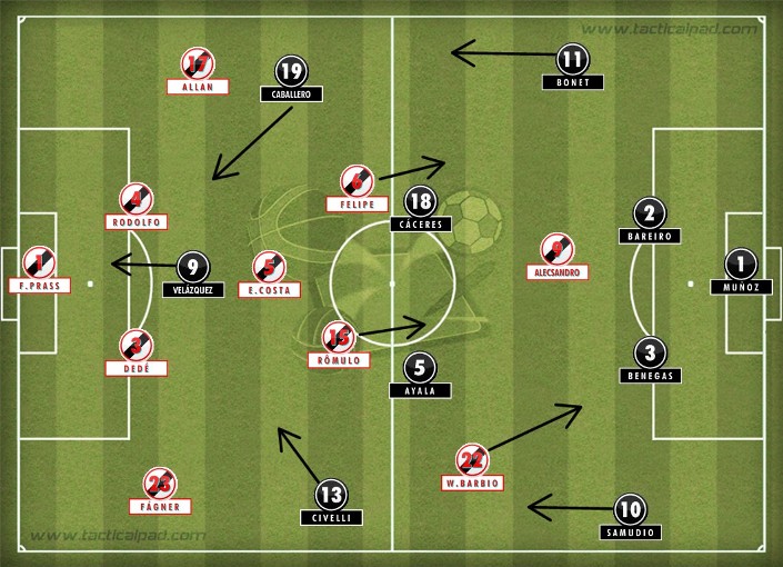 - O esquema só não foi melhor aproveitado nos 30 minutos de amplo domínio cruzmaltino. Os muitos espaços entre as rotineiras linhas de quatro do time paraguaio e as deficiências na cobertura dos laterais Bonet e Samudio proporcionaram várias oportunidades. Mas o Vasco só foi às redes na bola parada em que Fágner “emulou” Juninho e colocou na cabeça de Diego Souza;
