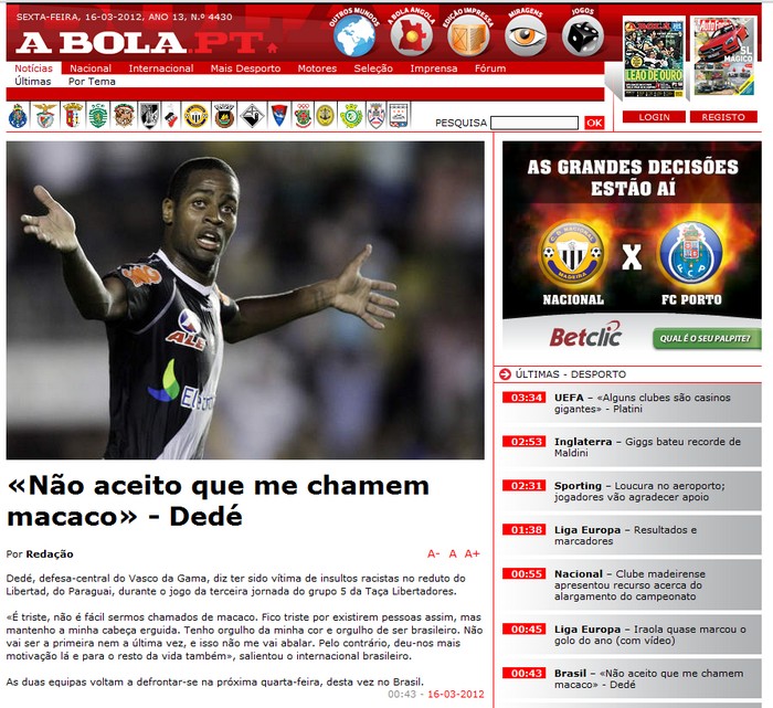 Dedé, defesa-central do Vasco da Gama, diz ter sido vítima de insultos racistas no reduto do Libertad, do Paraguai, durante o jogo da terceira jornada do grupo 5 da Taça Libertadores.