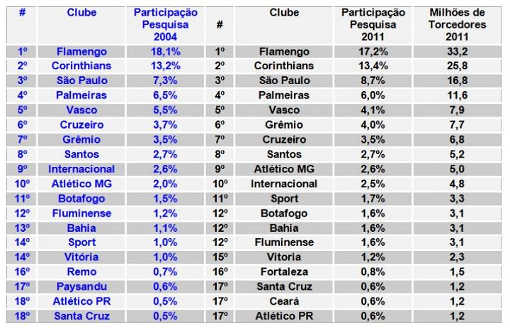 A tabela a seguir vai mostrar com mais facilidade essa diversidade. Ela apresenta as 19 maiores torcidas do Brasil conforme as pesquisas Lance/IBOPE divulgadas em 2004 e em 2011. Na última coluna, temos o número estimado de torcedores de cada clube no ano de 2011, baseado, portanto, na pesquisa correspondente. Optei por essas duas pesquisas em função do período coberto, mas também poderia ter usado duas das várias pesquisas Datafolha sem problema. Os resultados das pesquisas dos dois institutos, de maneira geral, são bastante próximos, o que dá uma boa segurança quanto ao acerto das pesquisas e conhecimento da realidade.