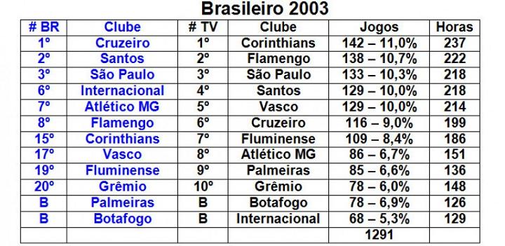 Nas nove temporadas desde 2003, primeiro Campeonato Brasileiro pelo sistema de pontos corridos, as emissoras de TV fizeram um total de 13.343 transmissões de jogos, a maioria ao vivo (reprises estão incluídas), dos doze clubes considerados maiores e mais tradicionais. São, também, os que estão presentes na Série A mais regularmente. Por emissoras, entenda-se o complexo formado pelas de sinal aberto – Globo e Bandeirantes – e sinal fechado – Sportv e Sportv 2 – e mais o conjunto de canais do Premiére, o PPV. Com nove anos de transmissões e esse número significativo de transmissões, temos, sem a menor dúvida, uma excelente base para uma boa visão sobre as transmissões de TV da principal competição do futebol brasileiro.