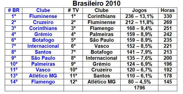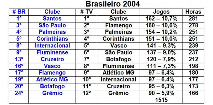 Voltando às tabelas ano a ano, fica claro que o desempenho esportivo de um time é muito importante na definição de quanto ele irá aparecer nas telas dos televisores. Se esse desempenho ocorrer num cenário em que outras equipes estão igualmente bem e disputando o título, aumentam as audiências e a exposição dessas equipes. Reparem que a exposição do Santos em 2004 foi bem superior à do Cruzeiro em 2003. Analisando os números, acredito em dois fatores determinantes para isso: a disputa de 2004 foi mais acirrada, já que em 2003 o Cruzeiro foi tão brilhante e à frente dos demais que caminhou tranquilo para o título. As emoções maiores ficaram nas disputas das vagas restantes para a Copa Libertadores e, mesmo assim, com boas folgas também. Outro fator que pode ter influído de forma considerável na maior exposição do Santos, que à época tinha uma torcida duas posições abaixo da cruzeirense, é o fato daquele time atrair audiência maior em regiões com maior potencial de consumo. O campeonato de 2010 é outro bom exemplo da importância da performance sobre a exposição do time, no caso o campeão Fluminense. Essa importância, que não se limita ao título, ficará mais clara na próxima tabela, que relaciona os clubes a partir do número total de transmissões de cada um. A tabela tem outros elementos importantes para serem analisados, que são: