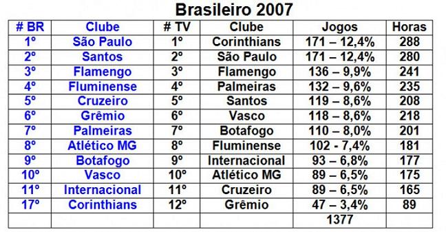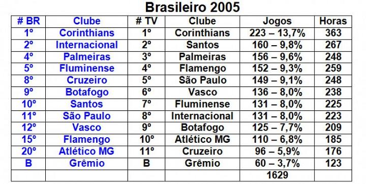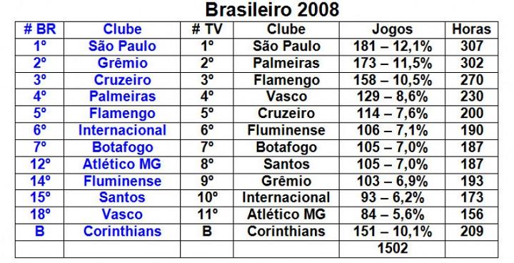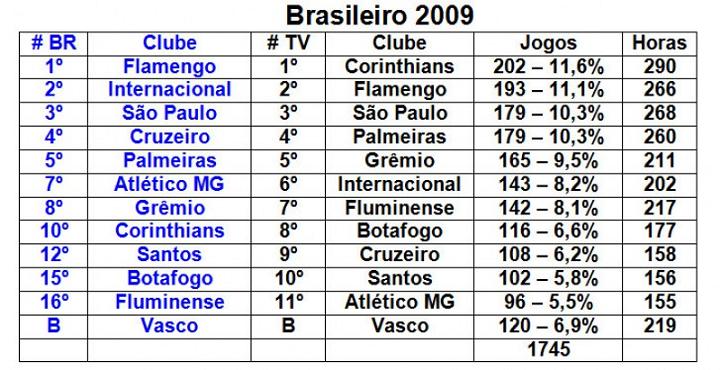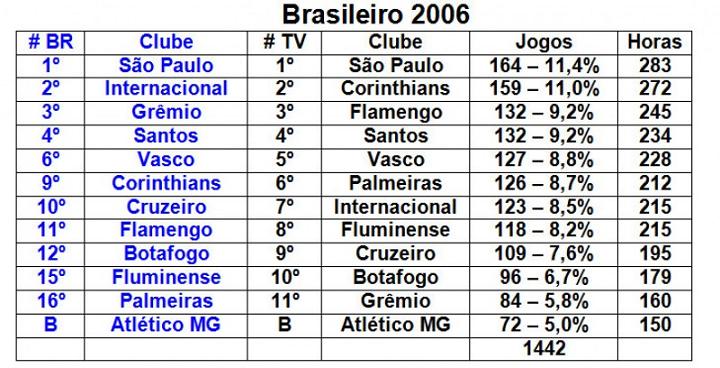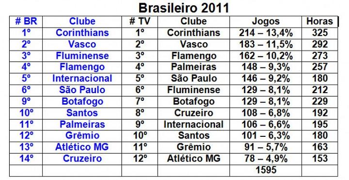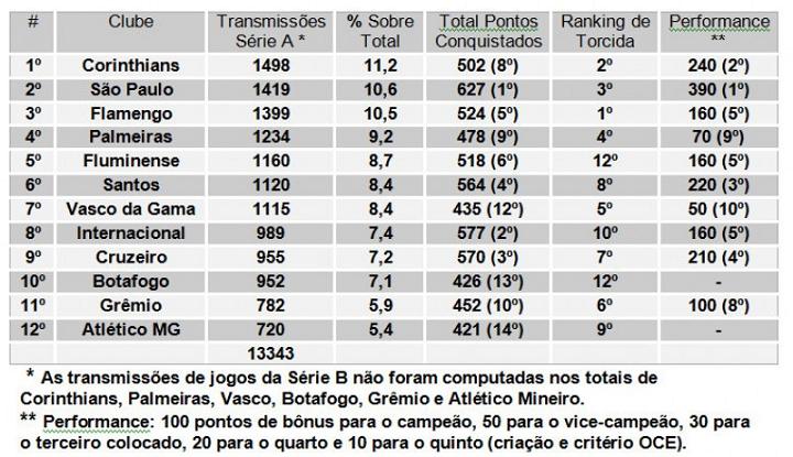 Graças ao mix de tamanho de torcida/audiência com a performance em campo e, ainda, um excelente potencial de consumo da torcida, a liderança ficou com o Corinthians. Os jogos pela Série B, embora constem da tabela anual, não foram computados aqui, que se refere excluivamente à Série A. Mesmo assim, o clube teve uma liderança com relativa folga.
