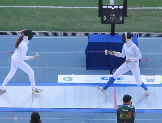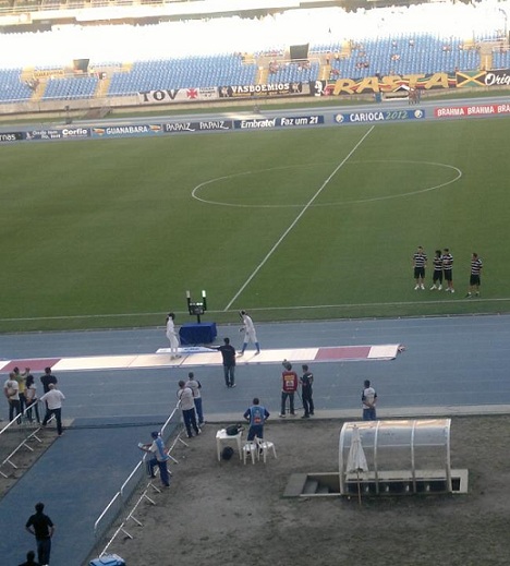 Uma cena inusitada fez parte do período que antecede o clássico entre Botafogo e Vasco na noite deste domingo. A pedido da Confederação Brasileira de Esgrima, uma disputa de exibição foi realizada no Engenhão antes de a bola rolar pela quarta rodada da Taça Rio. As atletas Camila e Barbara fizeram o duelo ainda diante de poucos torcedores no estádio com o objetivo de divulgar o esporte.