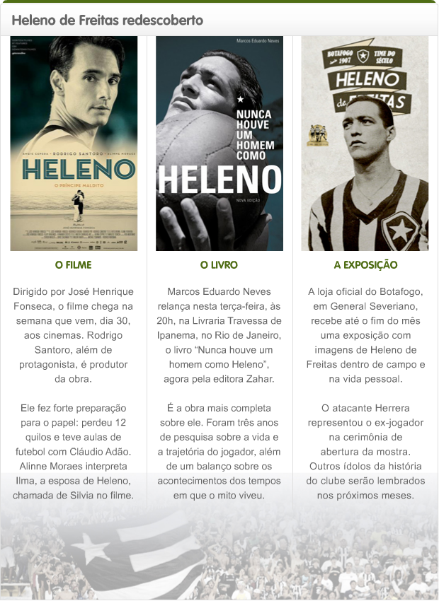 Chega aos cinemas na semana que vem, dia 30, o filme “Heleno – o príncipe maldito”, dirigido por José Henrique Fonseca (veja o trailer no vídeo ao lado). O ídolo alvinegro é vivido por Rodrigo Santoro – quase uma cópia da personagem que interpreta, com um nível de semelhança capaz de assombrar os familiares do craque trágico. A inspiração para a telona saiu do livro “Nunca houve um homem como Heleno”, de Marcos Eduardo Neves, levado às livrarias em 2006 e relançado agora. A loja oficial do Botafogo, em General Severiano, tem até o fim do mês uma exposição com fotos da carreira e da vida pessoal do ex-atacante.
