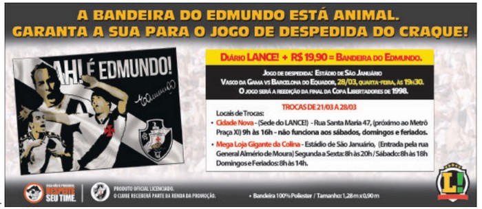 A partir de hoje e até o jogo de despedida, no dia 28, os leitores poderão comprar a bandeira exclusiva do Edmundo com desconto na sede do LANCE!. Para participar da promoção (e levar a bandeira para partida contra o Barcelona de Guayaquil, em São Januário) é preciso apresentar o cupom da promoção, no rodapé da página do Jornal Lance, no ato da compra. Na promoção, a bandeira sai por R$ 19,90. Edmundo deixou claro que conta com o apoio de todos os vascaínos na festa.