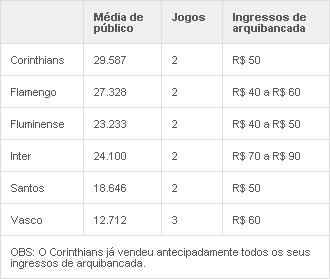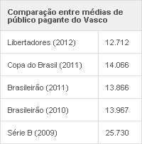 O curioso é que a Copa do Brasil do ano passado, competição que credenciou o Vasco a disputar a Libertadores, atraiu mais gente. Naquela campanha, que teve média de 14.066 pagantes, somente uma partida não teve público maior do que qualquer uma das três na Libertadores. Foi contra o Náutico, disputada com reservas, após vitória no jogo de ida por 3 a 0.