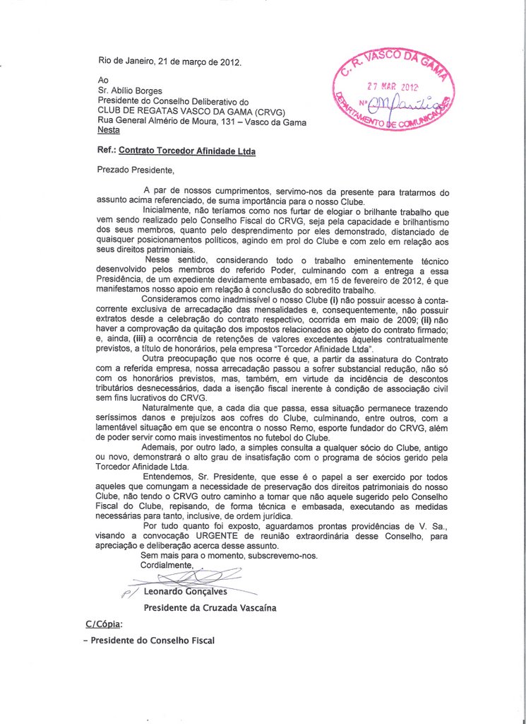 Nessa carta, o Conselho Fiscal informa que identificou severas irregularidades no contrato com a Torcedor Afinidade, empresa responsável pelo programa de sócios “O Vasco é Meu”, entre elas o fato da referida empresa não estar repassando ao clube os valores corretos.