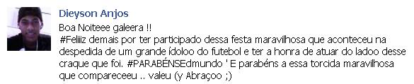- Feliz demais por ter participado dessa festa maravilhosa, que aconteceu na despedida de um grande ídoloo do futebol e ter a honra de atuar do ladoo desse craque que foi. Parabéns Edmundo. E parabéns a essa torcida maravilhosa que compareceu – postou o jovem em seu Facebook.