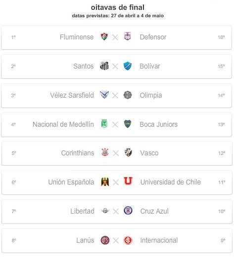 No momento, a única equipe brasileira fora da zona de classificação é o Flamengo, terceiro colocado do Grupo 2, atrás de Lanús e Olimpia. Confira abaixo como ficariam hoje as oitavas de final (a posição das partidas não forma o chaveamento para as fases seguintes).