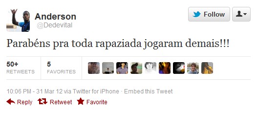 Via Twitter, Dedé parabeniza time que goleou Macaé