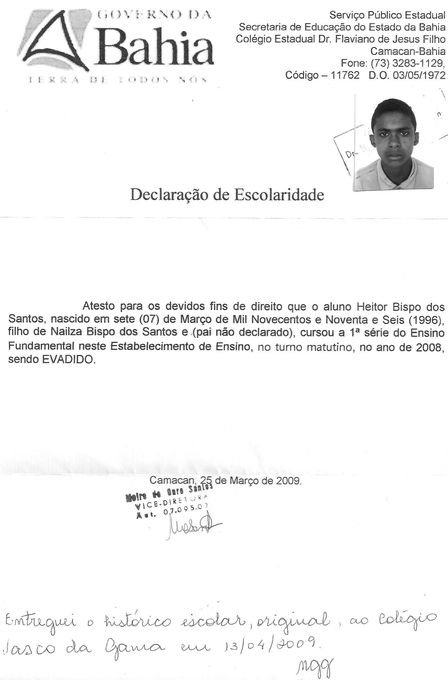 Para ingressar como atleta do Vasco, Fabricio virou Heitor em diversos documentos apresentados ao departamento de futebol do clube. Na declaração de escolaridade, retirada em 25 de março de 2009, aparece Baiano como "evadido" do Colégio Estadual Dr. Flaviano de Jesus Filho. No documento, consta a inscrição do Governo da Bahia. Aluno da sexta série até sair do colégio na Bahia, o jogador não tem pai declarado em nenhum dos documentos.