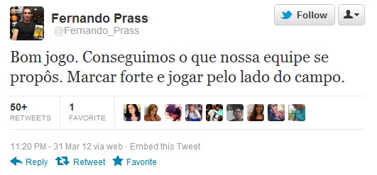 Fernando_Prass: Bom jogo. Conseguimos o que nossa equipe se propôs. Marcar forte e jogar pelo lado do campo.