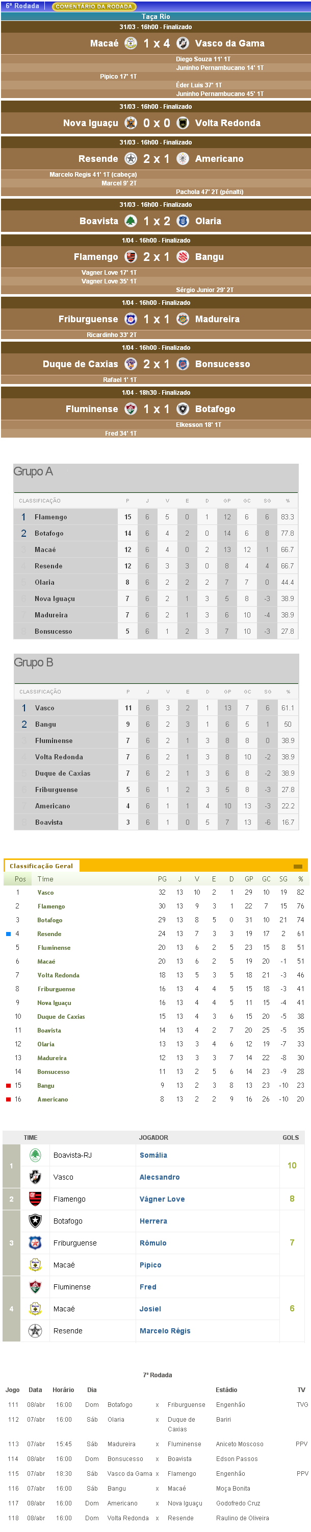 Terminada a 6ª rodada da Taça Rio, competição que corresponde ao 2º turno do Campeonato Estadual, o Vasco, que derrotou o Macaé por 4 a 1 e foi beneficiado pela derrota do Bangu para o Flamengo por 2 a 1, subiu da 2ª para a 1ª posição do Grupo B. O Gigante da Colina está agora 2 pontos à frente do Bangu, que é o vice-líder.