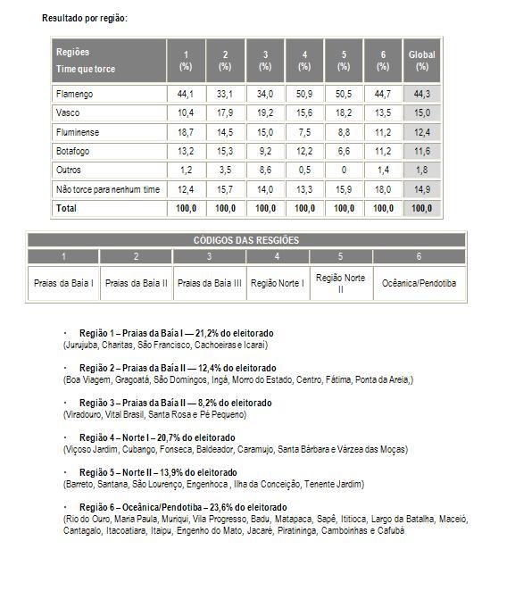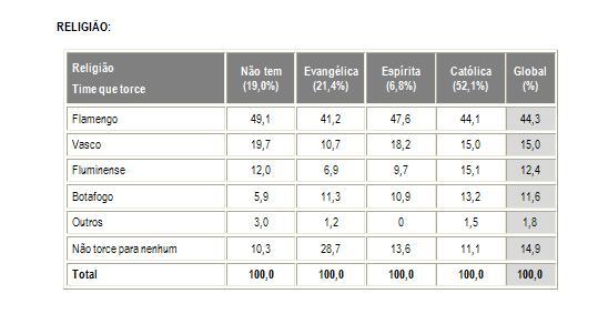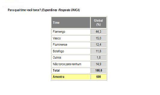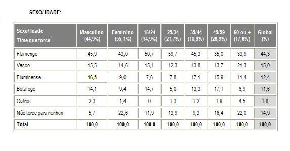 Como podemos ver, a configuração de torcidas na antiga capital do estado é a mesma da atual. Flamengo em primeiro (44,3%), totalizando mais do que seus três rivais somados. Em seguida, Vasco (15%), Fluminense (12,4%) e Botafogo (11,6%). Chama atenção a proximidade vascaína frente a tricolores e botafoguenses – considerando que o clube ainda não havia sido rebaixado, o que veio a ocorrer ao final de 2008.