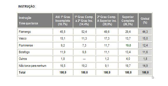 Nesta estatística, a torcida do Fluminense começa a mostrar por que é chamada de “torcida de elite”. Em movimento oposto ao flamenguista, tricolores saem da última posição entre os menos estudados (9,2%) para o segundo posto entre os mais letrados (19,8%). Rubro-negros com nível superior completo seriam 29,4%, com vascaínos e botafoguenses praticamente idênticos nesta categoria (13,7% a 13,4%).