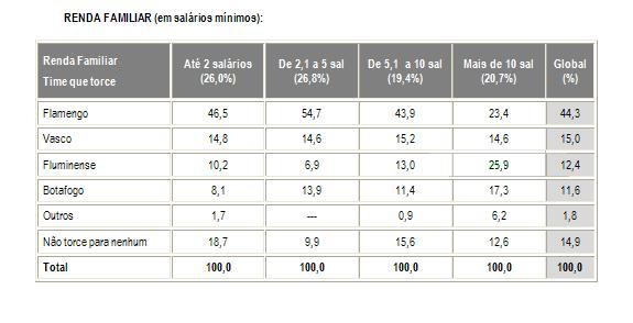 Eis a tabela mais importante da pesquisa. Segundo ela, a torcida mais abastada de Niterói seria a do Fluminense. Em meio àqueles com renda superior aos 10 salários mínimos, 25,9% seriam torcedores do clube das Laranjeiras. O Flamengo, em segundo, marca apenas 23,4%. Trata-se de uma situação inédita, sem paralelo nem na própria cidade do Rio de Janeiro. Ainda nesta faixa, a torcida do Botafogo (17,3%) supera a do Vasco (14,6%).
