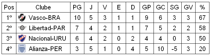 - O Vasco só não se classifica se, na última rodada, perder para o Nacional-URU por 2 gols de diferença em Montevidéu e o Libertad-PAR vencer o Alianza-PER em Assunção