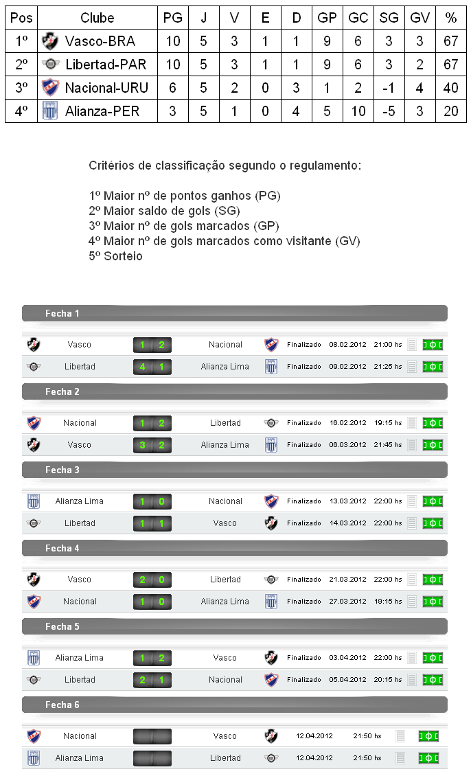 Terminada 5ª rodada do Grupo 5 da Copa Libertadores da América (a 2ª do returno), o Vasco, que derrotou o Alianza-PER por 2 a 1, ultrapassou o Libertar-PAR e pela primeira vez assumiu a liderança do grupo. O Gigante da Colina só supera o time paraguaio devido ao critério do maior nº de gols como visitante.