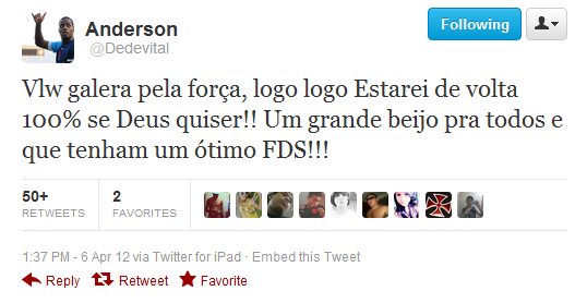 @Dedevital: Vlw galera pela força, logo logo Estarei de volta 100% se Deus quiser!! Um grande beijo pra todos e que tenham um ótimo FDS!!!