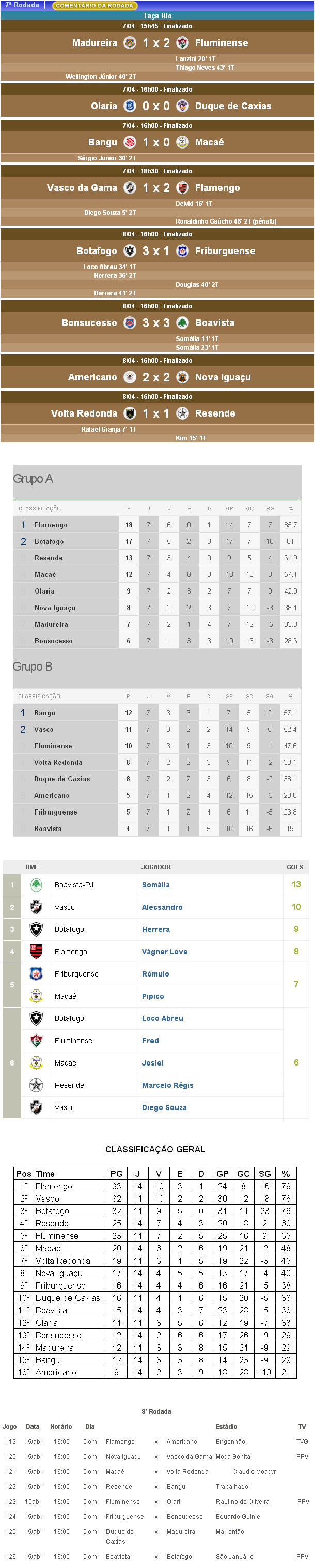 Terminada a 7ª rodada da Taça Rio, competição que corresponde ao 2º turno do Campeonato Estadual, o Vasco, que foi derrotado pelo Flamengo por 2 a 1, caiu da 1ª para a 2ª posição do Grupo B. O Gigante da Colina está 1 ponto atrás do Bangu, que é o novo líder.