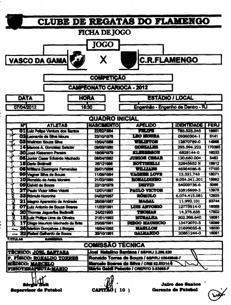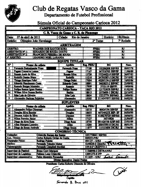 Considerando que apesar dos esclarecimentos apresentados na NOTA OFICIAL da Federação de Futebol do Estado do Rio de Janeiro e publicada ontem, diversos órgãos da mídia insistem, estranhamente e longe de retratar a verdade, em dizer ter havido adulteração da súmula da partida Vasco x Flamengo, quando o documento em questão trata-se de uma relação de participantes do jogo, elaborada pelo CR Vasco da Gama e NUNCA pela arbitragem ou pela Federação. Convém ressaltar que tal documento, que também é afixado na porta do vestiário antes dos jogos, foi inadequado e erroneamente denominado de forma impressa como “Súmula Oficial do Campeonato Carioca 2012”, bastando para comprovar a inadequação desse título uma simples comparação com semelhante documento elaborado e publicado pelo CR Flamengo ou ainda de qualquer outra partida, de todas as categorias, devidamente divulgados no site da FERJ. Qualquer outro modo de entendimento alimenta a dúvida, distorce a verdade, evidencia desconhecimento do que seja súmula e não distingue súmula de relação de jogo. (docs anexos).