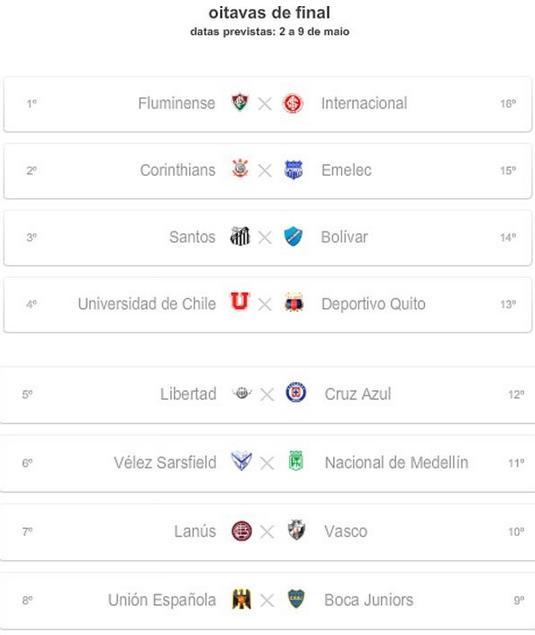 Já os demais brasileiros só se encontram a partir das quartas de final. O Vasco, por exemplo, encara o Lanús-ARG, enquanto o Corinthians enfrenta o Emelec-EQU, que eliminou o Flamengo - único time do País a não chegar à etapa eliminatória. O Santos, atual campeão do certame, por sua vez, terá pela frente o Bolívar.