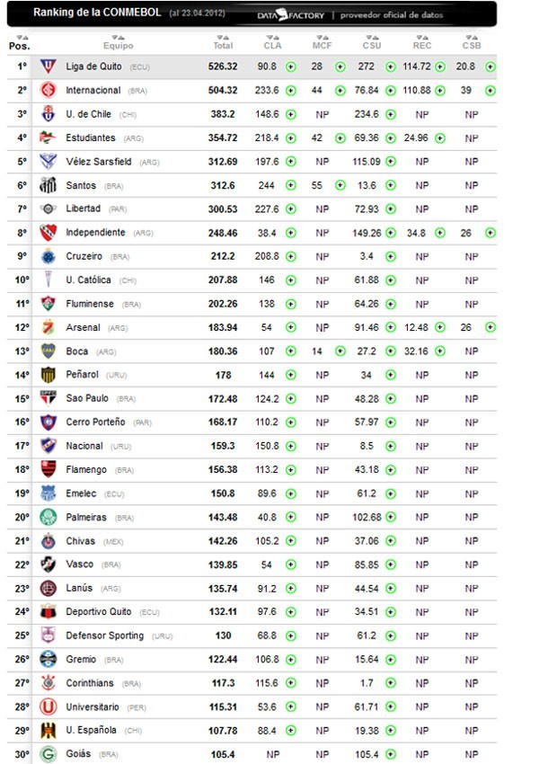 O Lanús era o 22º e foi ultrapassado justamente pelo time da Colina, próximo adversário na fase, ficando em 23º. Rival do Fluminense nesta quarta-feira, às 21h50m (de Brasília), no Beira-Rio, o Internacional está em segundo e é o melhor brasileiro na lista. A equipe está atrás apenas da LDU. Em terceiro está a Universidad de Chile.