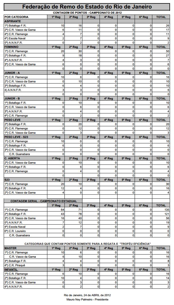 FOI APROVADA, PELA COMISSÃO DE ARBITRAGEM, A 2ª REGATA DO CAMPEONATO ESTADUAL, REALIZADA NO DIA 23 DE ABRIL DE 2012, NA LAGOA RODRIGO DE FREITAS CUJO RESULTADO FOI O SEGUINTE:
