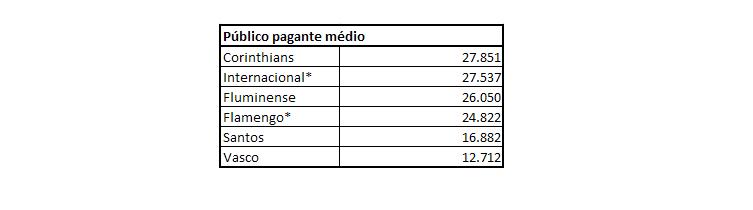 O Corinthians manteve a ponta no público pagante médio, mas ela se tornou apertada por conta do crescimento de Internacional e Fluminense. Em partidas com forte apelo (diante Santos e Boca Juniors, respectivamente), os times que hoje se enfrentam jogaram em estádios cheios, inflando seus números. Quem saiu perdendo foi o eliminado Flamengo. Pouco mais de doze mil pessoas pagaram para assistir à vitória sobre o Lanus (3 x 0), inócua por conta do resultado que classificou o Emelec frente ao Olímpia. Com isto, o Rubro-Negro despencou, só ficando à frente de clubes com estádios menores – Vasco e Santos.