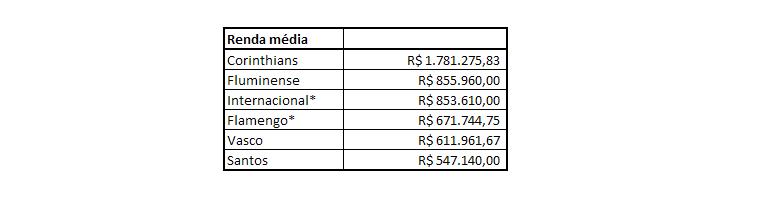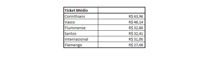 O resultado da renda pelo público nos gera o ticket médio das partidas. Aqui, a única alteração foi o Fluminense, que ultrapassou Santos e Internacional. Corinthians e Vasco se encontram muito à frente dos demais, diante da boa resposta de seus torcedores aos ingressos mais caros da Libertadores. Fla foi o último.