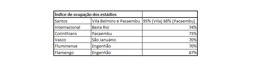 De segundo colocado no índice de ocupação (atrás do Santos, time que mandou partidas em estádios diferentes), o Flamengo caiu para o último posto. De todo modo, todos os clubes tiveram ocupação média superior a 2/3 de seus estádios, demonstrando o enorme chamariz representado pela Libertadores em sua edição 2012.
