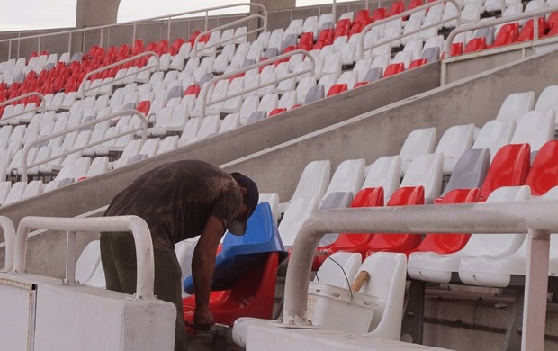 Às vésperas da decisão da Taça Rio, domingo, às 16h (de Brasília), entre Botafogo e Vasco, o Engenhão recebeu os últimos retoques. Funcionários do estádio fizeram nesta quinta-feira a troca de cadeiras da arquibancada e pintaram grades internas.