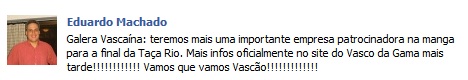 Eduardo Machado Galera Vascaína: teremos mais uma importante empresa patrocinadora na manga para a final da Taça Rio. Mais infos oficialmente no site do Vasco da Gama mais tarde!!!!!!!!!!!! Vamos que vamos Vascão!!!!!!!!!!!!!