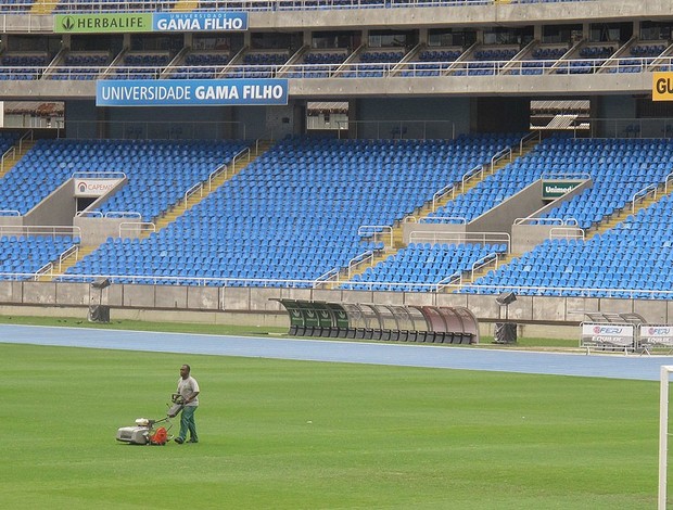 Na véspera da decisão da Taça Rio, entre Botafogo e Vasco, o gramado do Engenhão, já em boas condições, está sendo aparado na manhã deste sábado. Depois de um ano de críticas, o palco tem demonstrado boa resistência nesse começo de temporada. O clássico que dará o troféu e a vaga na final do Campeonato Carioca contra o Fluminense a uma das duas equipes acontece neste domingo, às 16h (de Brasília).