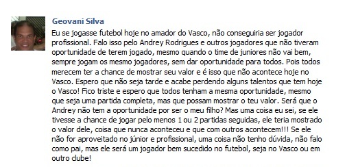 “Eu se jogasse futebol hoje no amador do Vasco, não conseguiria ser jogador profissional. Falo isso pelo Andrey Rodrigues e outros jogadores que não tiveram oportunidade de terem jogado, mesmo quando o time de juniores não vai bem, sempre jogam os mesmo jogadores, sem dar oportunidade para todos. Pois todos merecem ter a chance de mostrar seu valor e é isso que não acontece hoje no Vasco. Espero que não seja tarde e acabe perdendo alguns talentos que tem hoje o Vasco! Fico triste e espero que todos tenham a mesma oportunidade, mesmo que seja uma partida completa, mas que possam mostrar o teu valor. Será que o Andrey não tem a oportunidade por ser o meu filho? Mas uma coisa eu sei, se ele tivesse a chance de jogar pelo menos 1 ou 2 partidas seguidas, ele teria mostrado o valor dele, coisa que nunca aconteceu e que com outros acontecem!!! Se ele não for aproveitado no júnior e profissional, uma coisa não tenho dúvida, não falo como pai, mas ele será um jogador bem sucedido no futebol, seja no Vasco ou em outro clube!”