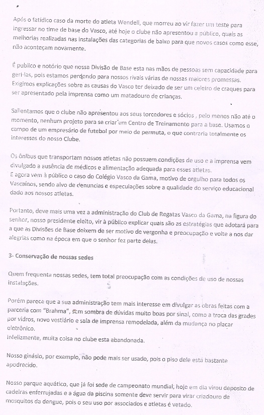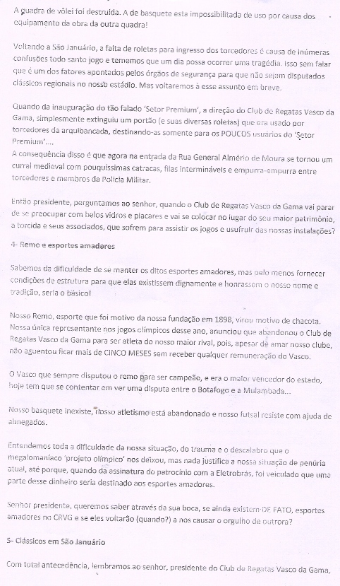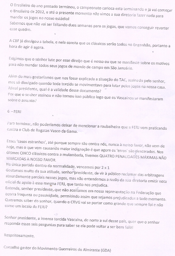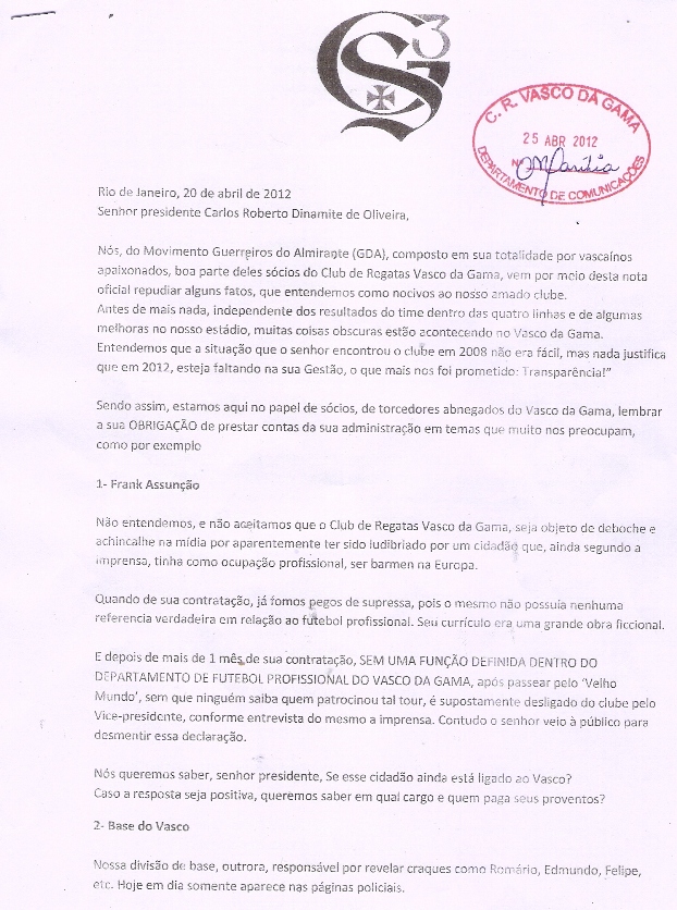 Nota Oficial protocolada no Vasco e enviada para o Presidente Roberto Dinamite, na data 25 de Abril de 2012.