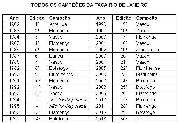 O Vasco perdeu, no último domingo (29/04), o título da Taça Rio 2012 para o Botafogo. Porém, segue como o maior campeão isolado da história do troféu. São 9 títulos do Gigante da Colina contra 8 do Flamengo, 6 do Botafogo, 2 do Fluminense, 1 do América, 1 do Bangu, 1 do Americano e 1 do Madureira.