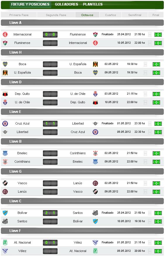 Nesta 3ª-feira (01/05) mais dois jogos foram realizados pelas oitavas-de-final da Libertadores da América. O Vélez Sarsfield-ARG derrotou o Nacional de Medellín-COL fora de casa por 1 a 0 e o Cruz Azul-MEX empatou em casa com o Libertad-PAR por 1 a 1.