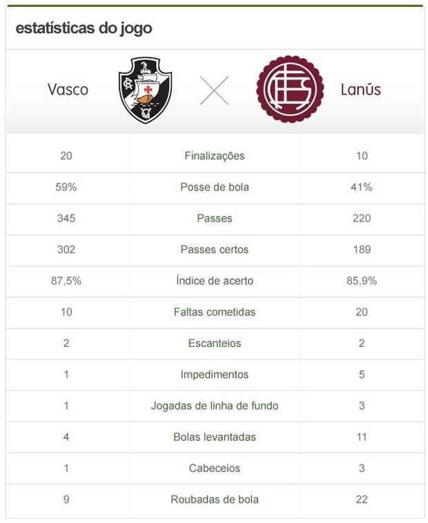 Com o resultado, basta ao Vasco um empate no jogo de volta, na próxima quarta-feira, na Grande Buenos Aires, para ficar com a vaga nas quartas de final. O Lanús, por sua vez, vai estar classificado se vencer por mais de um gol de diferença ou pelo placar de 1 a 0 (gol fora de casa é critério de desempate). Novo 2 a 1, desta vez a favor do Lanús, leva a decisão para os pênaltis. Qualquer outra vitória dos argentinos por um gol de diferença favorece o time brasileiro.
