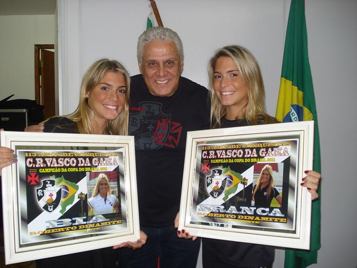 As gêmeas do nado sincronizado, Bia e Branca, foram homenageadas na noite desta quarta-feira (02/05), em São Januário. As vascaínas receberam um quadro de agradecimento pela participação como apresentadoras no “Vamos todos cantar de coração”, megashow de aniversário do Vasco, realizado em agosto do ano passado, no Citibank do Rio de Janeiro.
