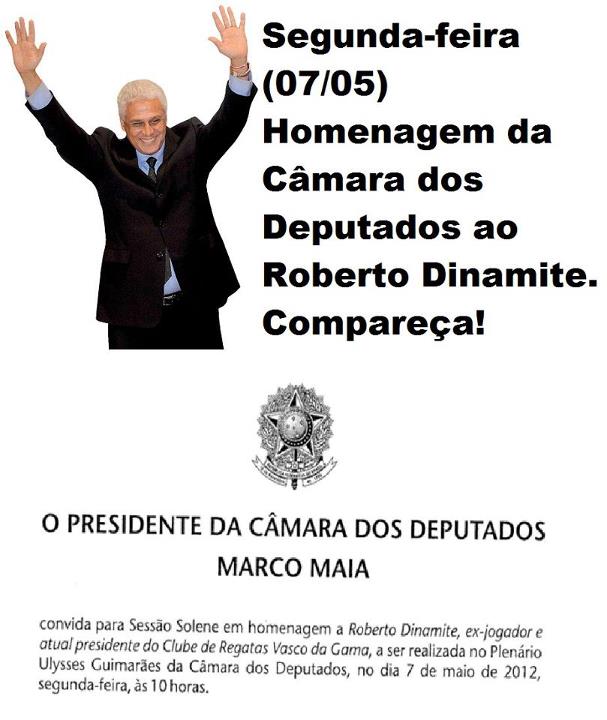 Maior ídolo do Vasco, presidente do clube e deputado estadual, Roberto Dinamite será homenageado pela Câmara dos Deputados, em sessão solene que será realizada nesta segunda-feira (07/05), às 10h, no Plenário Ulysses Guimarães da Câmara, em Brasília.