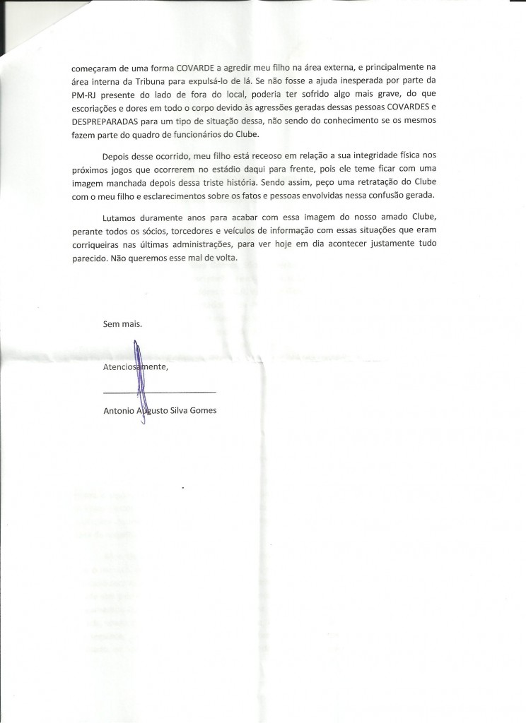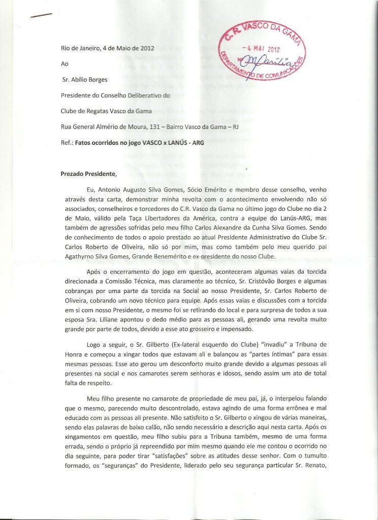 O conselheiro, eleito pela chapa da situação, Antonio Augusto Silva Gomes, filho do ex-presidente Agathyrno Silva Gomes e pai do sócio agredido no jogo contra o Lanus, Carlos Alexandre Cunha da Silva Gomes, protocolou no ultimo dia 4, sexta-feira, uma carta endereçada ao presidente do Conselho Deliberativo Abilio Borges pedindo uma justa retratação da diretoria do Vasco perante a lamentavel agressão sofrida pelo filho Alexandre e providencias imediatas em relação aos agressores.
