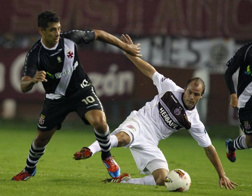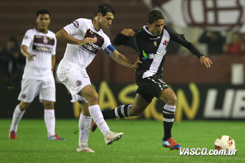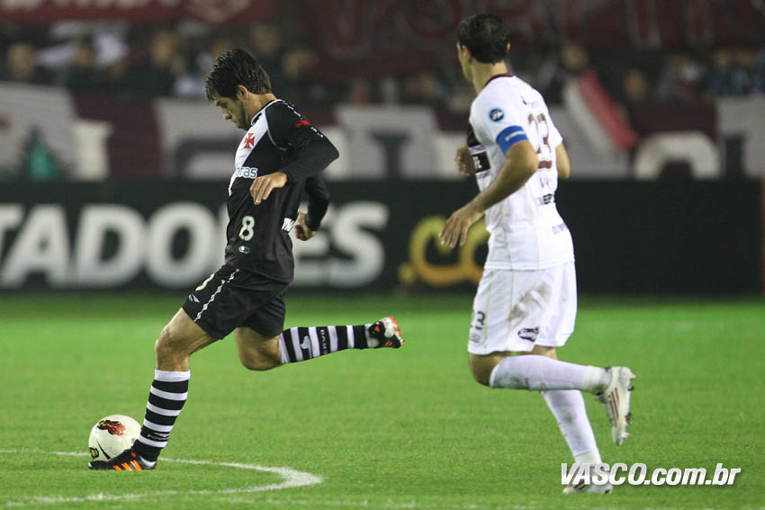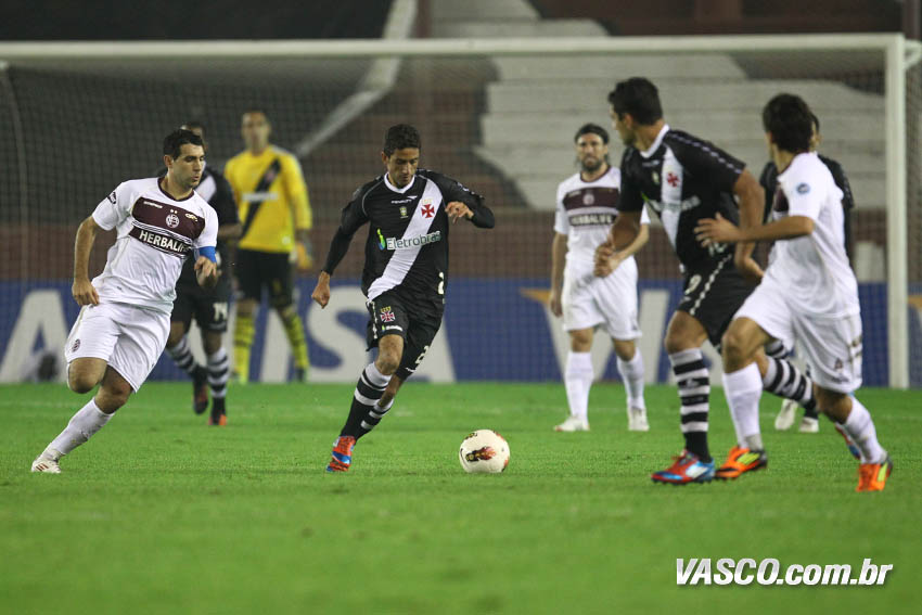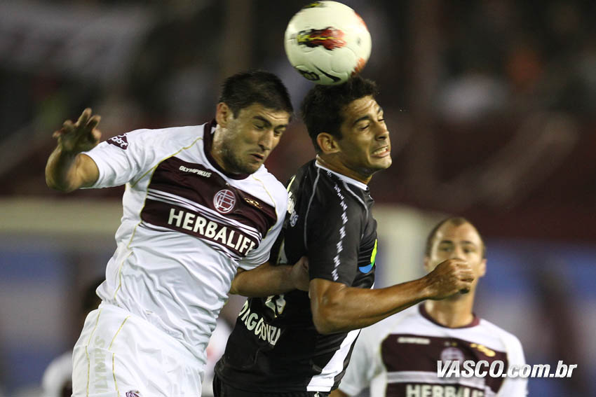 Apesar da necessidade do Lanús de correr em busca da vitória, o Vasco manteve maior posse de bola do que o adversário (51% ao fim do primeiro tempo) e levava perigo nos contra-ataques. Fagner teve boa chance pelo lado direito, mas se enrolou ao cortar para o meio dentro da área e tentar a finalização de perna esquerda. Diego Souza também teve boa oportunidade. O camisa 10 balançou na frente do marcador e tentou surpreender com um chute colocado no ângulo, mas errou o alvo. O Lanús pouco criou. Pavone e Camoranesi chegaram a ameaçar, mas Regueiro, que fez o gol em São Januário, novamente foi o mais perigoso. Nas costas de Fagner, o jogador do time argentino desviou de cabeça à direita do gol de Prass. Na primeira etapa, o Vasco finalizou sete vezes, enquanto os donos da casa chutaram seis.