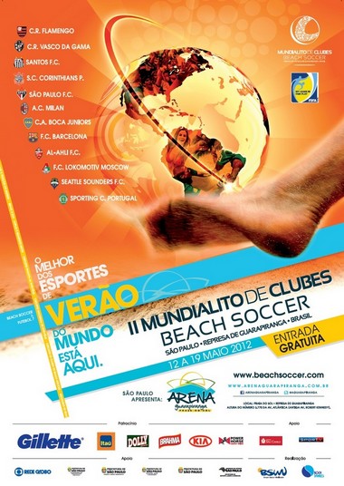 Está tudo certo para o início do II Mundialito de Clubes de Beach Soccer FIFA 2012, com início neste sábado, dia 12/05, e término no outro sábado dia 19/05, na Arena de Guarapiranga na grande São Paulo! Serão 12 grandes clubes em busca deste que é o mais importante título do esporte: Vasco da Gama, atual campeão, Flamengo, Corinthians, Santos e São Paulo do Brasil, Sporting de Portugal, Milan da Itália, Barcelona da Espanha, Lokomotiv Moscou da Rússia, Seatle dos EUA, Boca Juniors da Argentina e Al Ahli dos UAE.