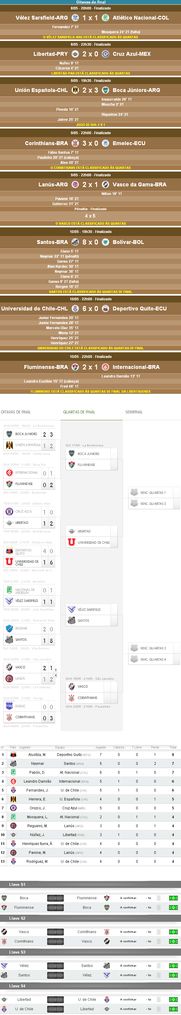 Terminou a fase de oitavas-de-final da Libertadores. Dos 8 clubes classificados às quartas-de-final, 4 são brasileiros, 2 são argentinos, 1 é chileno e 1 é paraguaio. Apenas metade deles (Vasco, Santos, Boca Juniors e Vélez Sarsfield) já sentiram o gostinho de conquistar a principal competição futebolística das Américas.