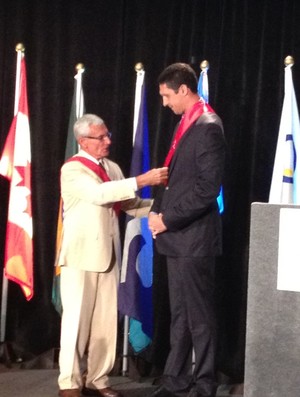 A faixa que marcou oficialmente a entrada do brasileiro no hall dos grandes nomes da natação foi entregue por Jon Urbanchek, treinador de Gustavo na década de 90, que também fazer parte do grupo dos homenageados. Além do técnico, estavam presentes na cerimônia os pais, a mulher e os filhos do nadador, além de amigos e outros parentes.
